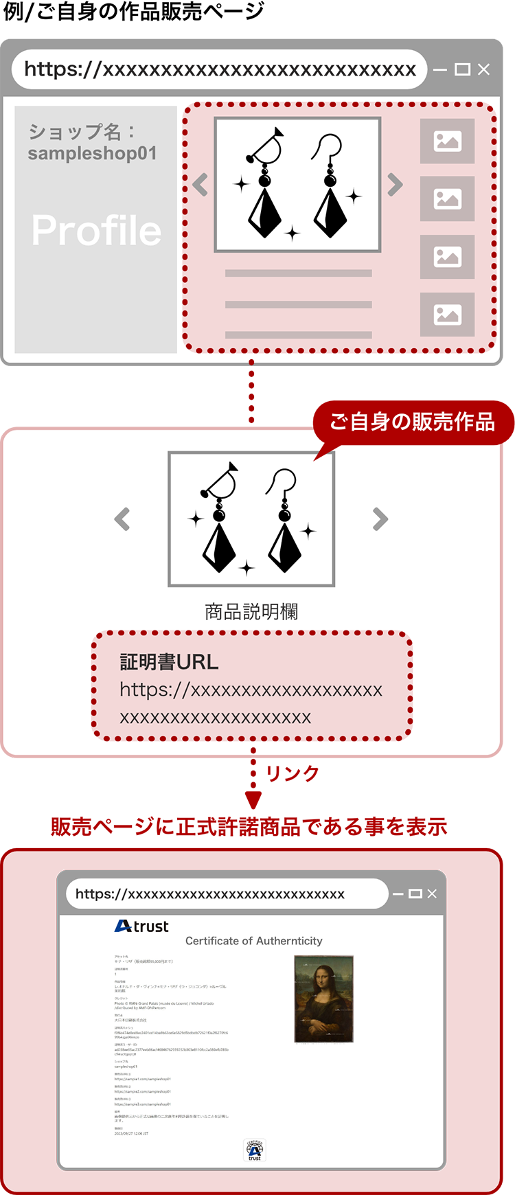 ご自身の販売ページに画像ライセンス(利用許諾)証明書URLを掲載し、正式許諾を得た画像で創作したことを証明することができます。